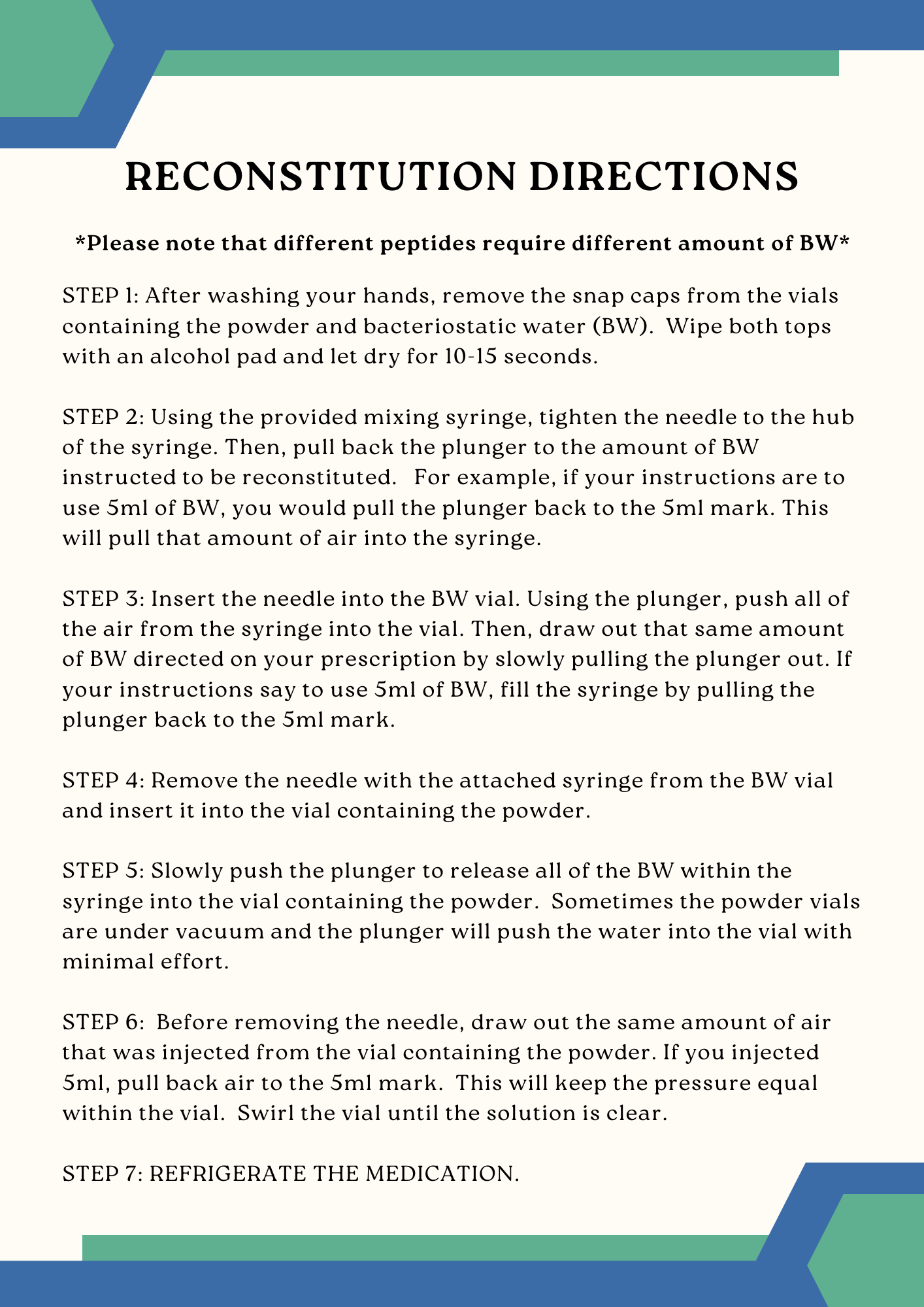 3. You will need to mix your vial and reconstitute it with 5ml bacteriostatic water when you receive it. A mixing kit with supplies and instructions will be sent with your order. After you have mixed the vial, it will need to be kept cool in the refrigerator. Please see direction below for mixing your medication: